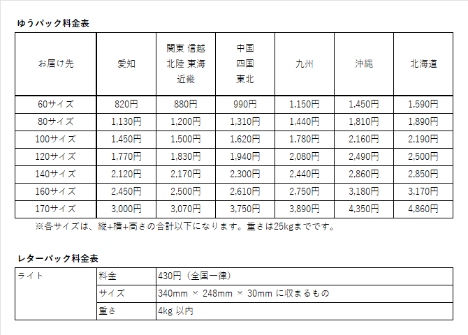 商品の配送は郵便局の「ゆうパック」または「レターパックライト」でおこなっております。